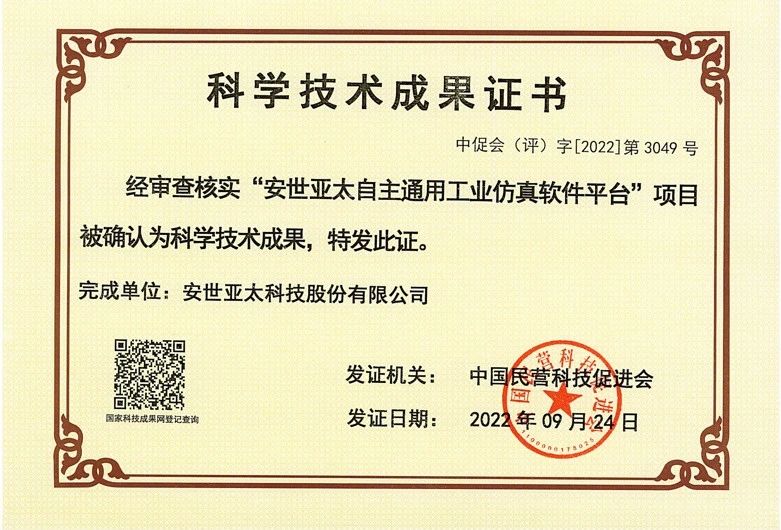 近日,安世亞太自主通用工業(yè)仿真軟件榮獲國家級《科學(xué)技術(shù)成果證書》。經(jīng)行業(yè)權(quán)威技術(shù)專家所組建的評價委員會嚴(yán)格評審后認(rèn)為,該項目綜合技術(shù)水平達(dá)到國內(nèi)領(lǐng)先,一致同意通過科技成果評價,正式發(fā)布證書,并加入國家科技成果網(wǎng)。