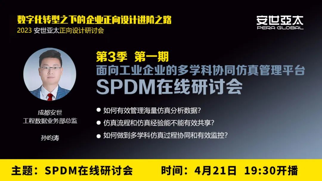 2023年4月21日19:30,安世亞太正向設(shè)計(jì)系列研討會(huì)——面向工業(yè)企業(yè)的多學(xué)科協(xié)同仿真管理平臺(tái)SPDM在線研討會(huì)即將上線。此次研討會(huì)特邀成都安世亞太工程數(shù)據(jù)業(yè)務(wù)部總監(jiān)孫昀濤先生,為大家分享交流。