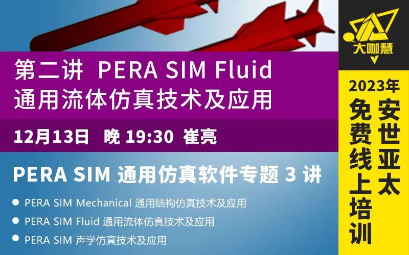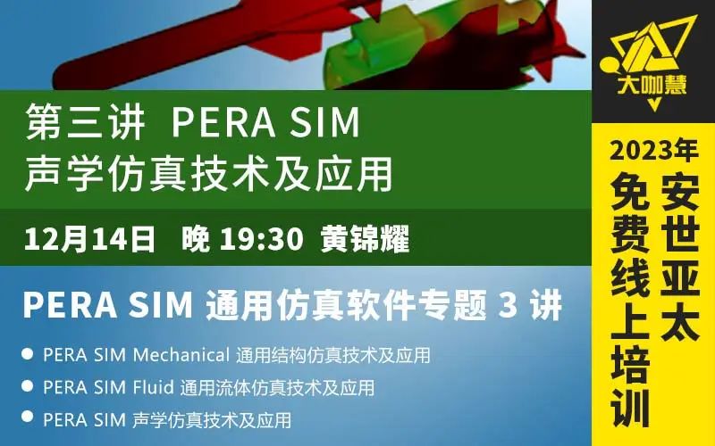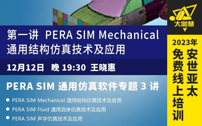 2023年12月12日-14日,每晚19:30,安世亞太舉辦PERA SIM通用仿真軟件三講專題課程免費(fèi)線上培訓(xùn)。本期課程包含主要介紹PERA SIM Mechanical 通用結(jié)構(gòu)仿真技術(shù)及應(yīng)用、PERA SIM Fluid通用流體仿真技術(shù)及應(yīng)用、PERA SIM聲學(xué)仿真技術(shù)及應(yīng)用。歡迎報(bào)名參加!
