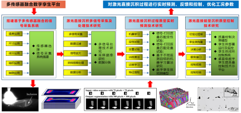 安世亞太的方案提出了一種基于多傳感器融合的數(shù)字孿生預(yù)測(cè)和控制激光直接沉積中的質(zhì)量的解決方案。該方案搭建了一個(gè)基于多傳感器融合的數(shù)字孿生平臺(tái)。平臺(tái)采用多傳感器實(shí)時(shí)采集所需信號(hào),通過(guò)信號(hào)處理和學(xué)習(xí)將傳感器采集的信息映射到高性能金屬構(gòu)件激光直接沉積的相關(guān)制備質(zhì)量參數(shù)(熔池溫度、熔池尺寸、成分、組織、內(nèi)部缺陷等信息),并實(shí)現(xiàn)實(shí)時(shí)的質(zhì)量預(yù)測(cè)和控制,提高高性能金屬構(gòu)件的打印質(zhì)量。