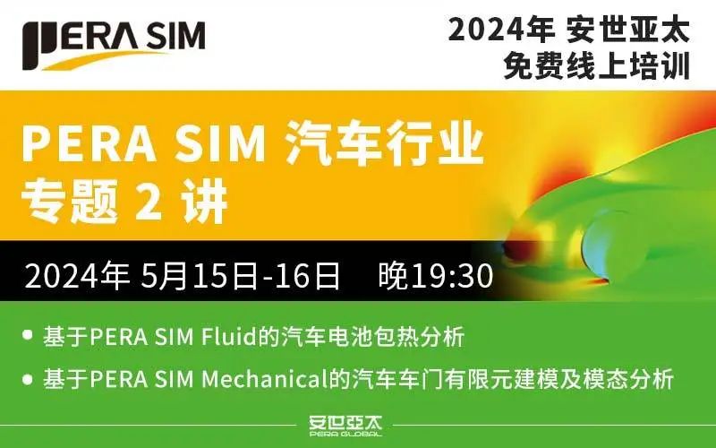 2024年5月15-16日,安世亞太大咖慧推出汽車行業(yè)專題仿真專題免費(fèi)線上培訓(xùn),專題講座包含:基于PERA SIM Fluid的汽車電池包熱分析、基于PERA SIM Mechanical的汽車車門有限元建模及模態(tài)分析,精彩內(nèi)容,不可錯(cuò)過(guò)!