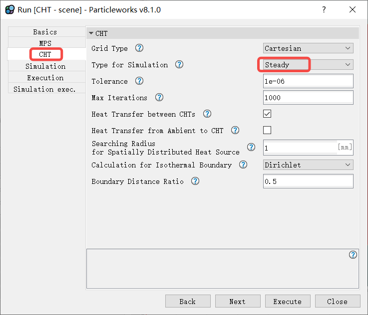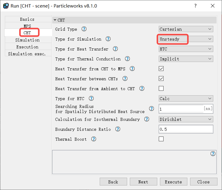 Particleworks的CHT(Conjugate Heat Transfer)耦合傳熱模塊,可以進行Unsteady瞬態(tài)和Steady穩(wěn)態(tài)的傳熱求解。采用瞬態(tài)傳熱計算,求解器通過判斷時間步長和物理時間,控制求解進程;可以直接實現(xiàn)流體粒子、與固體之間的耦合傳熱。采用穩(wěn)態(tài)傳熱計算,求解器通過計算結(jié)果的收斂程度控制求解進程;需要注意的是,穩(wěn)態(tài)傳熱中忽略了流體,只計算固體的溫度變化,如果需要分析流固的耦合傳熱,可以將流體的溫度、熱流、對流換熱系數(shù)等結(jié)果,作為邊界添加到穩(wěn)態(tài)熱分析中。