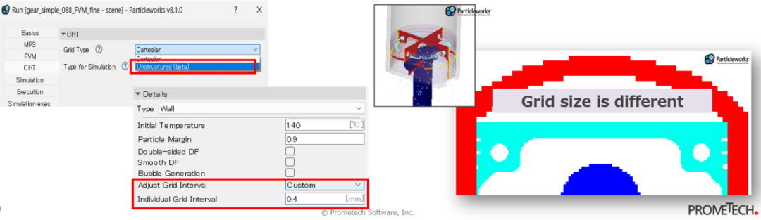 Particleworks的CHT耦合傳熱求解模塊中,首先需要確定Grid類型,即固體的離散方式。笛卡爾Cartesian類型是整個分析域中固體邊界采用統(tǒng)一的分辨率實現(xiàn)耦合傳熱計算;Unstructured是表示耦合傳熱中,不同的固體采用不同的尺寸大??;確定不同的離散類型可以優(yōu)化計算模型,對提高計算精度降低計算成本有很大的幫助。