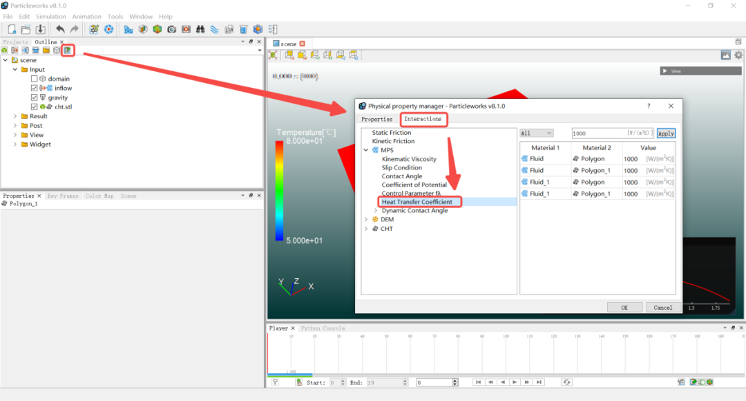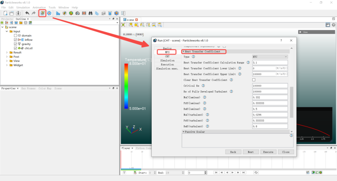 Particleworks中Heat Transfer Coefficient模型,可以基于流體流速、密度、導熱系數(shù)、比熱等參數(shù),計算出流體-固體之間的對流換熱系數(shù)。