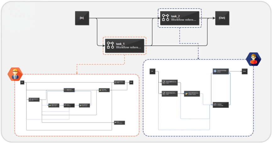多學科分析可以組織成一個工作流程,該工作流程可以引用公司內(nèi)部不同團隊創(chuàng)建和維護的其他獨立研究工作流程(圖 1)。通過引用這些獨立的工作流程,團隊可以靈活地組合成一個完整的工作流程,同時仍然允許編輯、獨立運行每個研究,并在多個工作流程中重復使用。在這種情況下,數(shù)據(jù)交換是自動化的,無需人工介入。