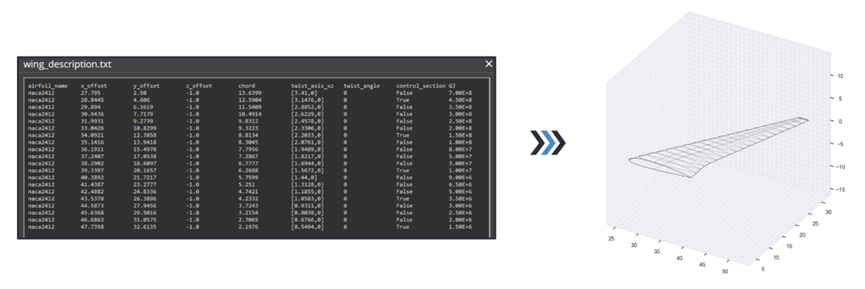 將機翼描述為一個三維曲面,并指定構(gòu)成機翼的所有橫截面的參數(shù)。這些信息可以保存在一個文本文件中(圖3),該文件稍后將用作工作流程的輸入和輸出。