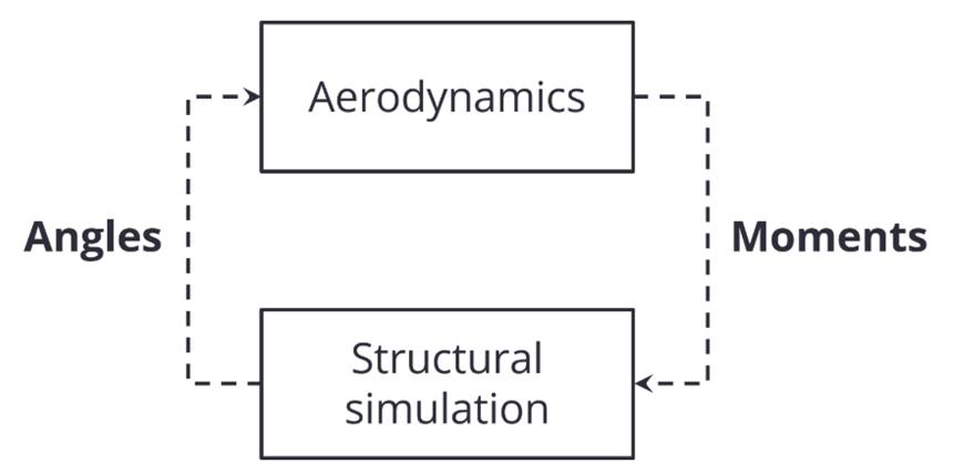 要解決的第一個問題涉及多學科分析,以確定機翼的真實變形形狀。該方法基于尋找來流產(chǎn)生的外部氣動矩與機翼內(nèi)部結(jié)構(gòu)矩之間的平衡點。首先,氣動分析估算作用于機翼的力因子,然后將其作為載荷應用于結(jié)構(gòu)模擬,以計算由此產(chǎn)生的變形。由于形狀發(fā)生了變化,需要重復氣動分析以獲得一組新的力因子。該計算循環(huán)(圖4)持續(xù)進行,直到幾何形狀的變化變得可以忽略不計。