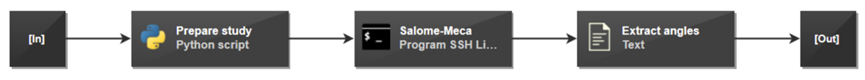結(jié)構(gòu)分析的工作流程(圖6)更為復雜。它包括通過“準備研究”模塊準備輸入文件、在Salome-Meca中進行模擬以及使用“提取角度”模塊進行后處理。Salome-Meca通過“Program SSH Linux”模塊集成,該模塊作為連接到遠程Linux計算機的連接器,并在該計算機上執(zhí)行任務。該工作流程的輸入是幾何參數(shù)和彎矩,輸出是每個橫截面的扭轉(zhuǎn)角。
