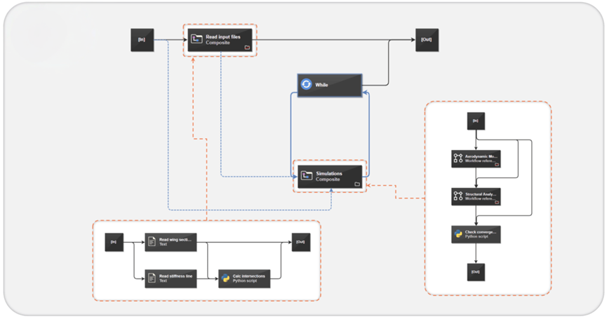 模擬過程位于“Simulations”復合模塊中,每個單域工作流都使用工作流參考功能導入,確保主工作流的每次運行都包含子工作流的最新版本,包括所有最新更改。使用 Python 模塊將當前迭代中獲得的扭轉(zhuǎn)角與上一次迭代的扭轉(zhuǎn)角進行比較。一旦滿足收斂標準,最終設(shè)計和彎矩值將被發(fā)送到輸出端口。該工作流的構(gòu)建方式使得用戶只需提供新的輸入文件即可設(shè)置新的運行,而預期結(jié)果將在輸出端口提供。