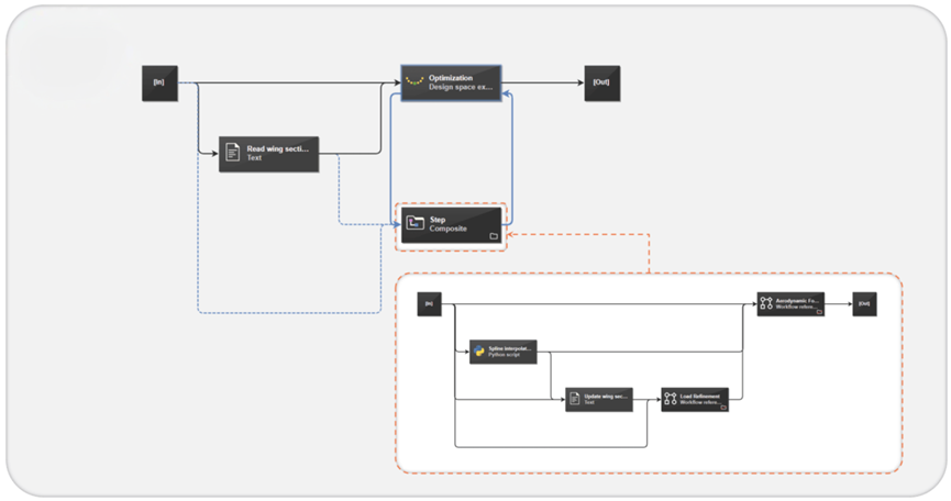 第一個文本塊解析包含機翼描述的輸入文件,并將參數(shù)輸出到其他塊,有效地充當格式轉(zhuǎn)換器?!皟?yōu)化”塊管理優(yōu)化周期,在每次迭代時請求評估新的設(shè)計。每個步驟都包含一個 Python 塊,該塊根據(jù)控制橫截面的值生成扭轉(zhuǎn)角;前述的“載荷細化”工作流程,用于確定機翼的真實形狀;以及另一個用于計算阻力和升力的 AeroSandbox 塊。一旦“優(yōu)化”塊找到最佳設(shè)計,結(jié)果就會發(fā)送到輸出端口。