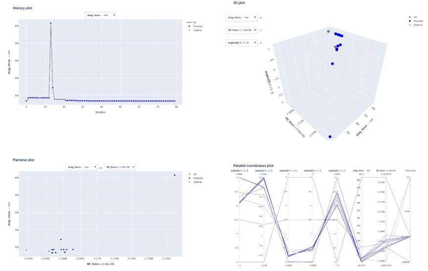提供基于機翼描述文件、用于 AeroSandbox 的飛機模型,并指定輸入端口值,例如飛行狀態(tài)條件、變量邊界和優(yōu)化預算。該工作流程還會生成優(yōu)化歷史記錄報告(圖 11)和更新的機翼描述文件,并通過輸出端口提供最佳旋轉(zhuǎn)角度值?;谳敵鰯?shù)據(jù),PERA智能體不僅輸出最終方案,還能提供多維設(shè)計空間的可解釋性分析、參數(shù)敏感度的智能評估和方案自動推薦等內(nèi)容。