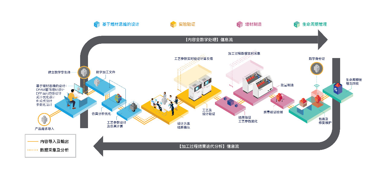 ?在全自動化增材制造裝備的基礎(chǔ)上,未來增材制造的核心業(yè)務(wù)流程主要可以分為四個部分,分別是基于增材思維的設(shè)計、實驗驗證(工藝參數(shù)的確定)、云端增材制造和產(chǎn)品生命周期管理。整個流程由一條數(shù)字主線和若干個數(shù)據(jù)采集及分析模塊串聯(lián)起來,即從先進設(shè)計到云端增材制造是一種高度數(shù)字化的表達,每一個細(xì)節(jié)要素均有跡可循,清晰且流程化。