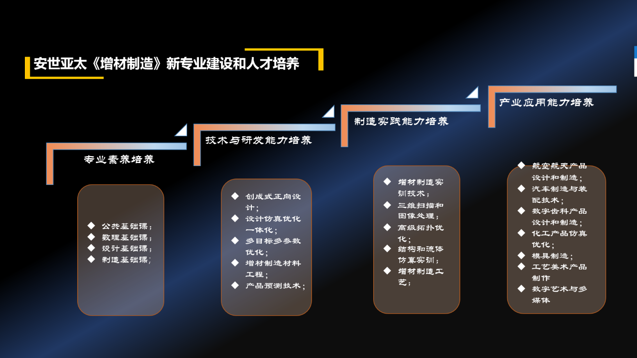 安世亞太力推增材制造新專業(yè)建設教學服務業(yè)務、增材制造系列教材、開展增材制造創(chuàng)新人才聯(lián)合培養(yǎng)、組建產(chǎn)業(yè)學院合作業(yè)務,愿幫助高等院校打造增材制造產(chǎn)教融合創(chuàng)新示范基地。