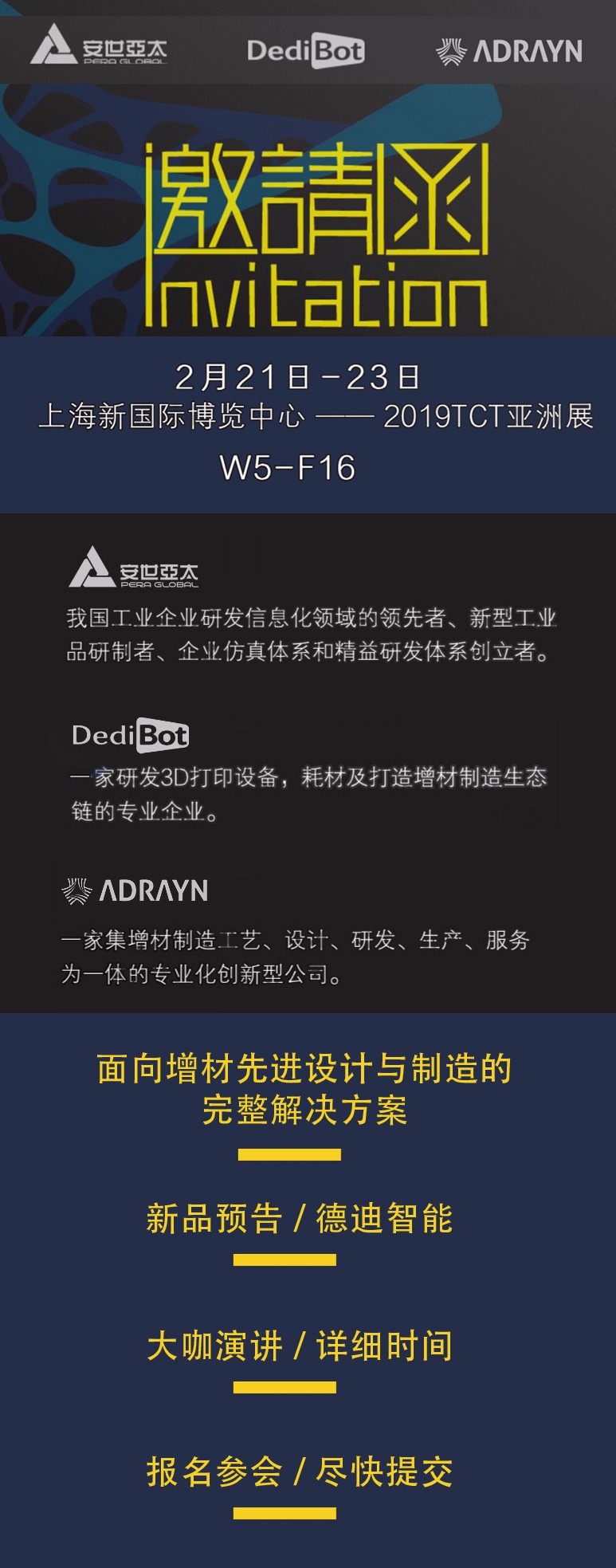 安世亞太、德迪智能、安德瑞源將再度攜手亮相展會,“增材思維+先進設(shè)計+智能制造”2019新產(chǎn)品全球首發(fā),誠邀您的到來!(展位號W5-F16)。