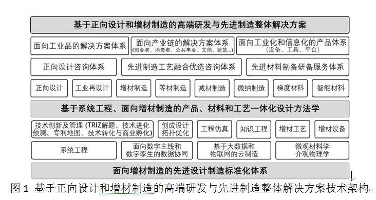 基于正向設(shè)計(jì)和增材制造的高端研發(fā)與先進(jìn)制造整體解決方案的技術(shù)架構(gòu)參照了錢學(xué)森在系統(tǒng)觀點(diǎn)指導(dǎo)下1980年代初提出的“三個(gè)層次一座橋梁”的現(xiàn)代科學(xué)學(xué)科體系一般框架,包括基礎(chǔ)學(xué)科層——系統(tǒng)工程、數(shù)學(xué)、物理學(xué)、材料學(xué)等,信息化使能環(huán)境——面向數(shù)字主線和數(shù)字孿生的數(shù)據(jù)協(xié)同、基于大數(shù)據(jù)和物聯(lián)網(wǎng)的云制造,技術(shù)學(xué)科層——TRIZ及技術(shù)創(chuàng)新和管理、拓?fù)鋬?yōu)化、工程仿真、知識工程,工程技術(shù)層——基于系統(tǒng)工程面向增材制造的產(chǎn)品材料工藝一體化設(shè)計(jì)方法學(xué)、及其流程體系組合配置而成的正向設(shè)計(jì)咨詢體系、先進(jìn)制造工藝融合優(yōu)選咨詢體系、先進(jìn)材料制備研備服務(wù)體系,工程實(shí)踐層——面向工業(yè)品的解決方案體系(如飛機(jī)、航空發(fā)動機(jī)、汽車、模具等)、面向產(chǎn)業(yè)鏈的解決方案體系(如創(chuàng)業(yè)者、消費(fèi)者、高等教育和職業(yè)培訓(xùn)等公共事業(yè)、文創(chuàng)、建筑等)、面向工業(yè)化和信息化的產(chǎn)品體系(工藝和材料設(shè)備、軟件工具和平臺等),核心內(nèi)容為: