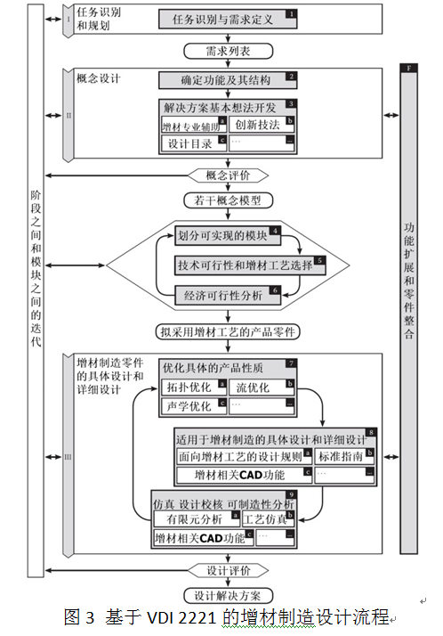 面向增材制造的設(shè)計(jì)的總體流程如圖2所示。這一流程涵蓋了產(chǎn)品的需求分析、架構(gòu)設(shè)計(jì)、詳細(xì)設(shè)計(jì)等過程。在實(shí)際應(yīng)用時(shí),需要將這一指導(dǎo)性流程與雙V模型的系統(tǒng)工程過程框架進(jìn)行結(jié)合。圖3給出了基于德國標(biāo)準(zhǔn)機(jī)械產(chǎn)品系統(tǒng)化設(shè)計(jì)VDI2221的面向增材制造的設(shè)計(jì)流程,可以認(rèn)為這是圖2按VDI2221在研發(fā)階段上的具體化。支撐上述面向增材制造設(shè)計(jì)頂層流程的是若干專業(yè)化子流程,如基于MBSE的系統(tǒng)建模、拓?fù)鋬?yōu)化及仿真和創(chuàng)成設(shè)計(jì)一體化流程,面向增材制造的創(chuàng)成設(shè)計(jì)流程等。