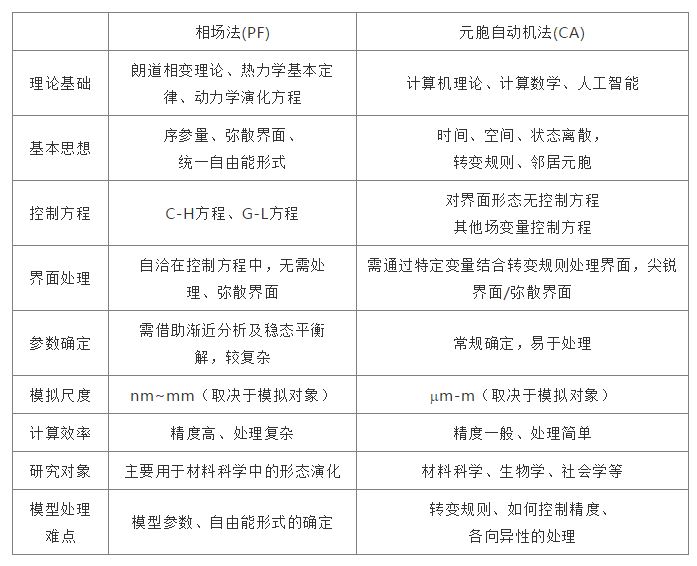相場法的關(guān)鍵是引入序參量場F和彌散型界面,使界面位置隨空間和時間的變化隱含在相場變量隨時間和空間的演化之中,朗道理論用于描述微觀組織的演化,微觀組織演化則通過求解控制空間上不均勻的序參量場的時間關(guān)聯(lián)的相場動力學(xué)方程而獲得。相場法的優(yōu)點主要是無需跟蹤界面、易于處理復(fù)雜的生長行為(如各向異性等)、與熱力學(xué)直接相關(guān),可耦合真實熱力學(xué)、動力學(xué)數(shù)據(jù)庫、易于與一些物理機制關(guān)聯(lián)(如外場)。缺點主要在于計算量巨大、速度慢效率低、需構(gòu)造自由能函數(shù)(有時很復(fù)雜)、界面不真實、、一些物理參數(shù)獲取較困難、數(shù)學(xué)處理復(fù)雜,同時可模擬的尺度較?。ㄗ畲罂蛇_幾十個微米),計算區(qū)域小。