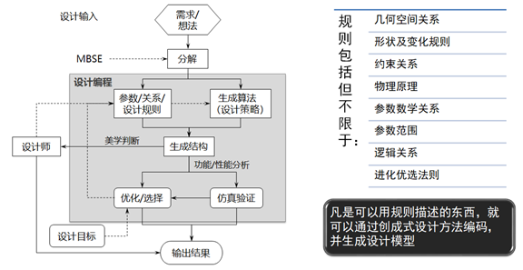 創(chuàng)成式設(shè)計(jì)是通過(guò)編程進(jìn)行的,設(shè)計(jì)師們的設(shè)計(jì)思維模式和工作過(guò)程也更像是一個(gè)程序員。他們不再需要在腦子里想出具體的形象,而是需要圍繞任務(wù)、設(shè)計(jì)目標(biāo)、功能、約束、幾何關(guān)系、變形規(guī)則等等,厘清它們的關(guān)系,并且可以用規(guī)則來(lái)描述它們,這一描述規(guī)則的過(guò)程我們可以稱為基于模型的系統(tǒng)工程(MBSE),但這比現(xiàn)在各家所推的MBSE方法所分解的顆粒度更細(xì)。有了這些規(guī)則模型后,就可以著手進(jìn)行編程了。