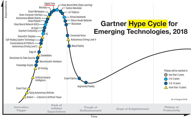 先來看近幾年Gartner公司的技術趨勢預測。2017年,數(shù)字孿生體出現(xiàn)在新興技術成熟度曲線的上升段(圖2);2018年,數(shù)字孿生體到達了曲線的頂點(圖3)。Gartner公司認為數(shù)字孿生體技術需要5-10年到達曲線的平臺期。2019年,數(shù)字孿生體未出現(xiàn)在曲線中,標志著它已不再是新興技術,而是進入主流技術行列。