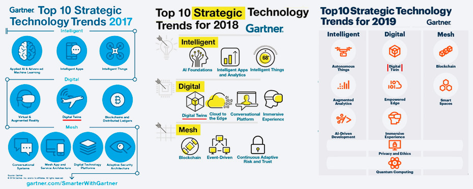 而且,數(shù)字孿生體技術從2017年到2019年,連續(xù)三年入選Gartner十大戰(zhàn)略技術趨勢(圖4)。Gartner公司將戰(zhàn)略技術趨勢定義為具有重大顛覆性潛力的趨勢,正在從新興狀態(tài)中發(fā)展壯大,有望產(chǎn)生更廣泛的影響及應用范圍,或者正在以巨大的波動性迅速增長,并預計能夠在未來五年內達到臨界點。