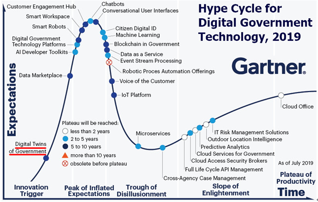 再進一步,2019年7月,Gartner公司發(fā)布數(shù)字政府技術成熟度曲線(圖5),“政府的數(shù)字孿生體”赫然出現(xiàn)在曲線的起點。