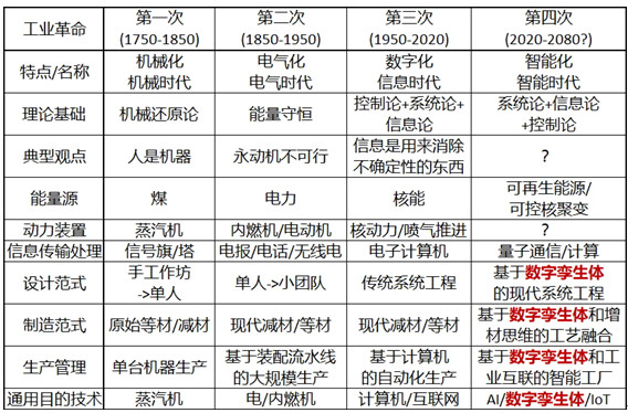 有了這個終極目標,我們可以通過回望人類歷史的歷次工業(yè)革命,來分析數(shù)字孿生體技術在即將到來的第四次工業(yè)革命中的地位和作用。表1中的部分項目借用了圖6的TRIZ理論技術系統(tǒng)完備性法則的模板,限于篇幅僅選取了工業(yè)化這一個視角,引入了技術經(jīng)濟學中的“通用目的技術”這一概念。通用目的技術(GPT)是一種單一的通用技術,在其整個生命周期中都具有以下公認的四個特征:(1) 最初有很大的改進余地,(2) 最終被廣泛使用,(3) 具有多種用途,(4) 并具有許多溢出效應。目前普遍認為,蒸汽機、電和內燃機、計算機分別是頭三次工業(yè)革命的GPT;主流觀點也接受AI是第四次工業(yè)革命的GPT。雖然數(shù)字孿生體技術滿足GPT的四個充分必要條件,雖然我們有上述咨詢機構給出的市場預測和技術預測,但在技術經(jīng)濟學領域還未正式認可數(shù)字孿生體技術是第四次工業(yè)革命的GPT,需要技術經(jīng)濟領域的專家或數(shù)字經(jīng)濟學家做專業(yè)的論證。我個人對相關技術、經(jīng)濟以及技術和經(jīng)濟的互動持審慎樂觀的態(tài)度,相信未來的趨勢在共識中。