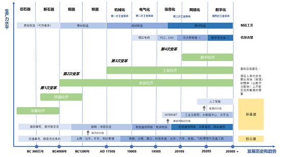 生產(chǎn)力水平的發(fā)展對(duì)于產(chǎn)業(yè)經(jīng)濟(jì)的促進(jìn)和基礎(chǔ)設(shè)施的保障,如下圖所示。云大物智鏈等IT使能技術(shù)的發(fā)展,以及增材制造等制造工藝領(lǐng)域的突破,正在推動(dòng)第四次工業(yè)革命的到來,以及數(shù)字經(jīng)濟(jì)的發(fā)展。