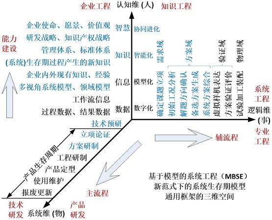 傳統(tǒng)的系統(tǒng)工程方法以霍爾模型作為核心,提出了由時(shí)間維、邏輯維和知識(shí)維所構(gòu)成的三維空間抽象結(jié)構(gòu),構(gòu)成了系統(tǒng)工程的方法框架。