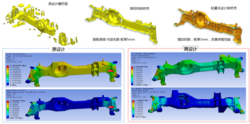 汽車前橋的再設(shè)計(jì)則是通過(guò)設(shè)計(jì)實(shí)現(xiàn)工業(yè)品減重的最為典型的案例。在前橋殼原結(jié)構(gòu)基礎(chǔ)上,將內(nèi)部加筋處理,采用增材制造技術(shù)整體成型,實(shí)現(xiàn)了將原來(lái)由數(shù)十個(gè)鋼制零件連接而成的前橋殼整體鑄造成一個(gè)鋁制零件,在不降低性能指標(biāo)的前提下,重量得到大幅降低。