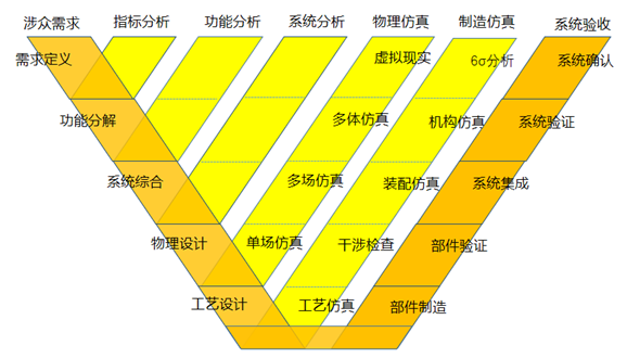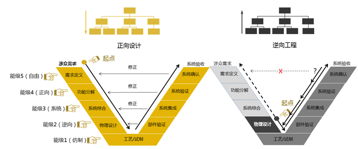 系統(tǒng)工程是被世界先進(jìn)企業(yè)廣泛采用的復(fù)雜產(chǎn)品的研發(fā)方法與理論體系,而正向設(shè)計(jì)是系統(tǒng)工程理論的核心。應(yīng)用系統(tǒng)工程理論對(duì)產(chǎn)品設(shè)計(jì)過(guò)程進(jìn)行分解和展開(kāi),形成V字流程,如下圖(左)所示。