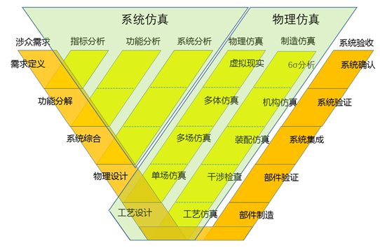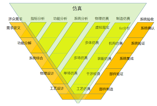 習(xí)慣上,人們把需求分析、功能分析和系統(tǒng)分析統(tǒng)稱為系統(tǒng)仿真,把物理仿真與制造仿真統(tǒng)稱為實(shí)物仿真。系統(tǒng)仿真的模擬對(duì)象是系統(tǒng)架構(gòu),屬于抽象模型,而物理仿真和制造仿真的模擬對(duì)象是產(chǎn)品實(shí)體,屬于實(shí)物模型。因此,系統(tǒng)仿真往往用于在概念階段確認(rèn)產(chǎn)品的總體架構(gòu),實(shí)物仿真通常用來(lái)確認(rèn)物理產(chǎn)品的初步設(shè)計(jì)、詳細(xì)設(shè)計(jì)、工藝設(shè)計(jì)和制造過(guò)程。