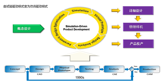 產(chǎn)品仿真是產(chǎn)品研發(fā)設(shè)計(jì)過(guò)程中的主要仿真類型,它使產(chǎn)品研發(fā)模式從過(guò)去試驗(yàn)驅(qū)動(dòng)模式轉(zhuǎn)變?yōu)榉抡骝?qū)動(dòng)模式。下圖的下半部分展示了曾經(jīng)的試驗(yàn)驅(qū)動(dòng)模式。這種模式的特點(diǎn)是串行,仿真是在試驗(yàn)之后進(jìn)行分析確認(rèn)。這種模式下,仿真的作用很小,處于輔助地位。串行模式在產(chǎn)品周期和成本方面都具有較大風(fēng)險(xiǎn)。