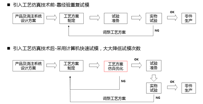 目前,仿真已經(jīng)在工藝設(shè)計(jì)中廣為應(yīng)用。下圖反映了工藝設(shè)計(jì)引入仿真前后的差別。在引入仿真技術(shù)之前,工藝設(shè)計(jì)的特點(diǎn)是利用大量實(shí)物試驗(yàn)確認(rèn)工藝的可行性。而在引入仿真技術(shù)之后,工藝方案通過(guò)仿真手段進(jìn)行確認(rèn)和優(yōu)化,形成最優(yōu)方案后進(jìn)行實(shí)物試驗(yàn)確認(rèn)。通常仿真確認(rèn)和優(yōu)化后,只需要經(jīng)過(guò)很少的實(shí)物試驗(yàn)即可形成最終方案,在成本和周期方面具有巨大效益。