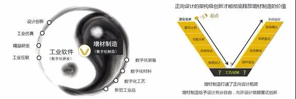 圍繞正向設(shè)計(jì),工業(yè)軟件和增材制造之間具有一種奇妙的哲學(xué)關(guān)系。以正向設(shè)計(jì)為核心和主線,工業(yè)軟件通過支撐正向設(shè)計(jì),在全生命周期支撐增材制造過程的完成。在數(shù)字化的世界里,研發(fā)和制造不是先后串行和跟隨序貫關(guān)系,數(shù)字化研發(fā)和數(shù)字化制造之間是一種相生相長、生生不息的特征,兩者之間在任何時(shí)候都是相輔相成、相互輸送價(jià)值的過程。