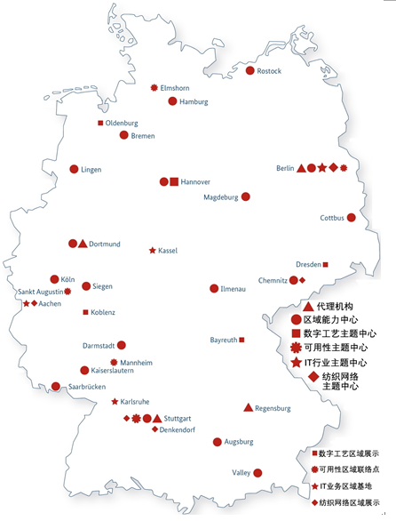 迄今為止,聯(lián)邦經(jīng)濟(jì)部已經(jīng)成立了27家能力中心(圖2),包括四家代理機(jī)構(gòu)(柏林、多特蒙德、斯圖加特、雷根斯堡),19家區(qū)域能力中心(奧格斯堡Augsburg、柏林Berlin、不來(lái)梅Bremen、開(kāi)姆尼茨Chemnitz、科特布斯Cottbus、達(dá)姆施塔特Darmstadt、多特蒙德Dortmund、漢堡Hamburg、漢諾威Hanover、伊爾默瑙Ilmenau、凱撒斯勞滕Kaiserslautern、基爾Kiel、K?ln科隆、林根Lingen、馬格德堡Magdeburg、羅斯托克Rostock、薩爾布呂肯Saarbrücken、錫根Siegen、斯圖加特Stuttgart)、四家主題能力中心(數(shù)字工藝、可用性、紡織網(wǎng)絡(luò)、數(shù)字經(jīng)濟(jì)和信息產(chǎn)業(yè))及其區(qū)域展示點(diǎn)或聯(lián)絡(luò)點(diǎn)。