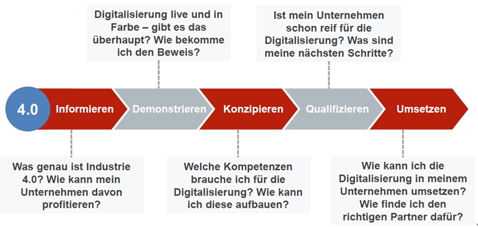 能力中心沿“賦能鏈”工作。首先提高意識(shí),并向給定地區(qū)的所有中小企業(yè)提供有關(guān)數(shù)字化的信息。對(duì)于那些希望進(jìn)行更全面接觸的公司,中心可以提供有關(guān)數(shù)字化如何在實(shí)踐中發(fā)揮作用的資格和示范。關(guān)于資格,能力中心關(guān)注中小企業(yè)的業(yè)務(wù)主管和IT專業(yè)人員以及其他資深員工。由于這些中心由聯(lián)邦經(jīng)濟(jì)部資助,因此這些中心免費(fèi)提供中立的服務(wù)。根據(jù)資金模型,不包括對(duì)各個(gè)公司的更深層次的咨詢。