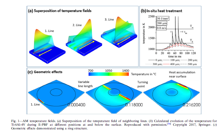 ??雖然金屬增材制造過程看似是一種焊接過程,其中通過高功率激光光束熔化粉末層,或者將金屬粉末注入由激光束產(chǎn)生的熔池中。然而焊接工藝和增材制造之間仍存在重要區(qū)別,在金屬增材制造過程中,數(shù)百小時內(nèi)會形成數(shù)百條線和數(shù)百層。因此,需要觀察到瞬態(tài)溫度場,溫度場的疊加,原位熱處理和幾何效應(yīng)。