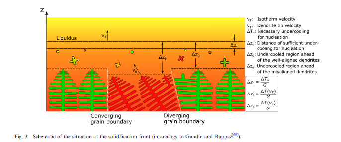 ??直到今天,幾位實驗家都報告了但沒有詳細(xì)研究這種現(xiàn)象。晶粒成核的原因之一是偏析的微觀結(jié)構(gòu)被重新熔化。在重熔過程中,可能會發(fā)生一些沉淀物或顆粒沒有完全溶解并充當(dāng)異質(zhì)核的現(xiàn)象。另外,單元或樹突與熔池之間的粗糙界面,或多或少的均勻熔體(對流)可能會導(dǎo)致強(qiáng)烈的過冷情況,尤其是在樹突間區(qū)域內(nèi)。后一種現(xiàn)象幾乎尚未被探索,并且將來需要進(jìn)行詳細(xì)的研究。