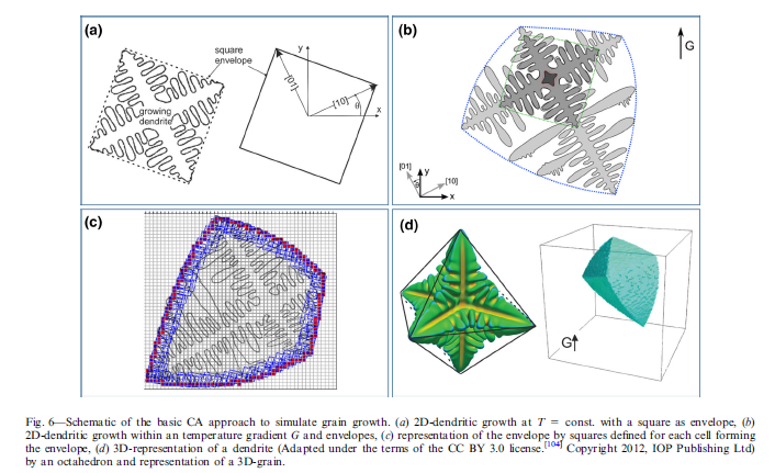 ?元胞自動機(jī)(CA)方法描述了晶粒尺度上的微觀結(jié)構(gòu)演變。對細(xì)胞或樹突的凸包膜進(jìn)行建模,而未捕獲細(xì)胞或樹突的結(jié)構(gòu)和分離。熱力學(xué)通過枝晶尖端速度和局部過冷的相關(guān)性進(jìn)入模型。CA模型具有預(yù)測零件尺寸晶粒結(jié)構(gòu)演變的潛力。還具有很高的能力來預(yù)測增材制造期間的紋理形成及其對工藝策略的依賴性。