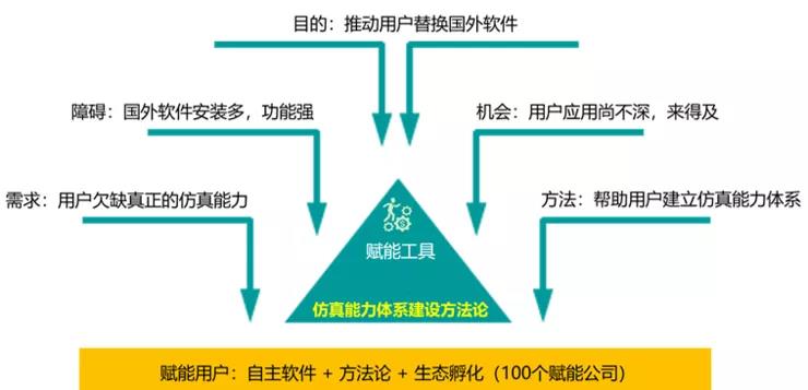 在賦能中國制造方面,安世亞太有一個賦能方法論。他們認為,用戶缺的不是軟件,因為一些國際上的軟件,購買是一方面,同時用戶也能使用盜版。在這種環(huán)境下,他們發(fā)現(xiàn)用戶用仿真建立的工業(yè)能力并沒有變強,究其原因是,并不在于軟件缺乏什么功能,而缺的是用戶端能力的輸入和輸出,而具體怎樣做用戶是不知道的。安世亞太注重于怎樣幫助用戶用仿真建立起來這樣的能力,而不只是把軟件賣給用戶。