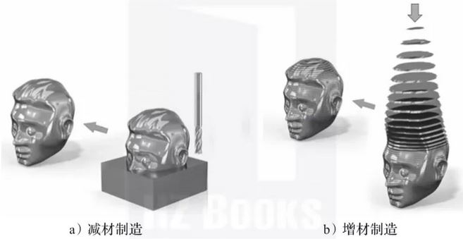 與減材制造工藝相比,增材制造是從零開始的,通過依次在前一層的頂部“打印”新的一層來構(gòu)建零件,直至零件完成(圖1-1b)。根據(jù)所使用的特定增材制造技術(shù),每一層的厚度也有所不同,在幾微米到約0.25mm之間變化,當(dāng)前有許多材料可以應(yīng)用于不同的增材制造工藝。