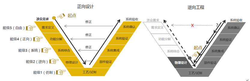 正向設(shè)計是針對逆向工程來說的。如果一款產(chǎn)品是正向設(shè)計的,那么它的研發(fā)過程將是一個完整的V模型。這個模型有兩個特點,一個是設(shè)計起點比較高,從“涉眾需求”開始,走完一個完整的“V”字。另一個特點是兩邊對稱,右邊出問題了,到左邊相應(yīng)的位置找到解決方案。而逆向工程是一個跟蹤仿制的模型,不是一個完整的V模型,一般會缺少V字左邊的三個重要的子過程,使得設(shè)計入手點就比較低,一般是從“物理設(shè)計”入手。由于兩邊不對稱,所以右邊出現(xiàn)問題的時候在左邊找不到對應(yīng)的過程,因而也無法徹底解決問題。逆向工程由于缺少的三個重要子過程分別是需求、架構(gòu)和系統(tǒng)設(shè)計過程,所以很難對產(chǎn)品進行大幅度創(chuàng)新。因此,只有正向設(shè)計體系才為我們提供架構(gòu)性和創(chuàng)新,再高超的仿制也只能產(chǎn)生二流產(chǎn)品。