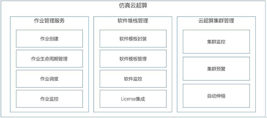 仿真云平臺的主要模塊有:仿真云桌面、仿真云數(shù)據(jù)、仿真云超算、仿真社區(qū)、APP交易與應用環(huán)境、APP可視化開發(fā)環(huán)境、通用IaaS和通用PaaS。