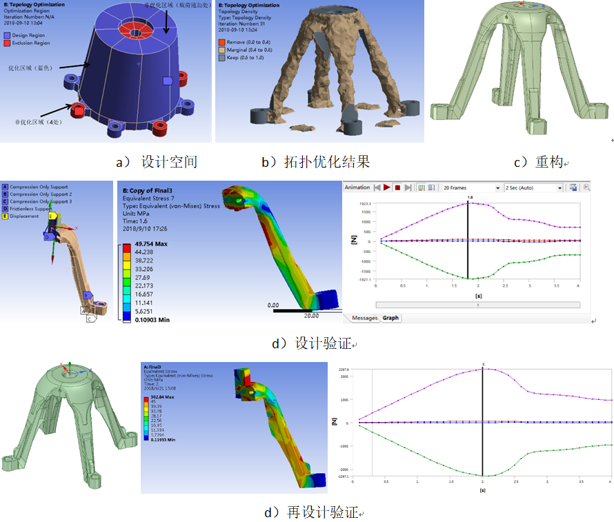 -然后基于拓撲優(yōu)化的材料分布確定參數(shù)化建模方案并利用參數(shù)優(yōu)化軟件optiSLang對參數(shù)化模型進行參數(shù)優(yōu)化,完成最終的詳細設(shè)計;-最后,對最終的詳細設(shè)計進行有限元分析,提取相應(yīng)的性能評價指標(biāo)值,并與原設(shè)計的相應(yīng)性能評價指標(biāo)進行比較,最終確定優(yōu)化設(shè)計是否滿足要求。