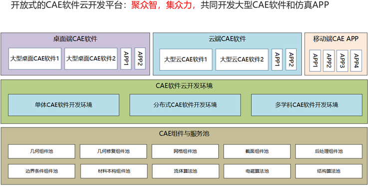 第二層,CAE軟件的云開發(fā)環(huán)境。這個環(huán)境可以開發(fā)單體的CAE軟件、分布式云CAE軟件,也可以做多學科聯合仿真CAE軟件。開發(fā)環(huán)境可以由實力比較強的研發(fā)單位來有償提供?;陂_發(fā)環(huán)境和下面的組件池、服務池,就可以開發(fā)上面的SaaS或者桌面級軟件。全社會都可以用這樣一個開發(fā)平臺來做桌面級的CAE軟件、云端的CAE軟件,甚至是移動端的CAE的APP。桌面級和云端都可以做大型的CAE軟件及APP。目前,桌面級軟件更容易做得更大型一點,未來我們相信云的技術發(fā)展之后,在云端也可以做大型的CAE軟件。