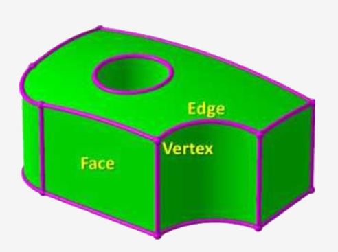 傳統(tǒng)的CAD系統(tǒng)軟件都使用B-reps(邊界定義法)來表達實體對象的外部形態(tài)。B-Reps指的是構(gòu)成物體邊界表面的集合,實體中的各個面將根據(jù)點和邊之間的拓?fù)潢P(guān)系進行串聯(lián)并形成實體, B-Reps概念如下圖所示: