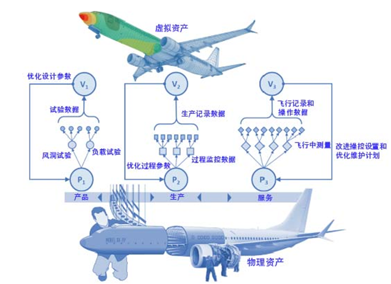 建模和仿真工具方面的最新進(jìn)展已經(jīng)實(shí)現(xiàn)了飛機(jī)研發(fā)過(guò)程、降低了飛機(jī)研發(fā)的成本和周期的可視化。已經(jīng)有一系列軟件工具可以幫助將工程圖進(jìn)行可視化,包括設(shè)計(jì)、制造、材料研發(fā)和性能、空氣動(dòng)力學(xué)、結(jié)構(gòu)集成和性能分析等。更重要的是,這些工具可以集成在一起以加強(qiáng)原本就是需要的工程周期間的互連性和加快設(shè)計(jì)、分析、測(cè)試的迭代。通過(guò)將大量分析轉(zhuǎn)變?yōu)榭梢暬绞?,可以減少昂貴的物理試驗(yàn)和設(shè)計(jì)迭代的次數(shù),從而達(dá)到減少認(rèn)可過(guò)程的時(shí)間和成本的目的。物理試驗(yàn)的數(shù)據(jù)(如試件試驗(yàn)、風(fēng)洞試驗(yàn)、地面試驗(yàn)、飛行試驗(yàn)、航線試驗(yàn)等)也可以用來(lái)更新虛擬試驗(yàn)的相關(guān)條件。數(shù)字孿生并不能消除物理測(cè)量和測(cè)試,只是減少了數(shù)量和對(duì)此類信息的依賴。物理和虛擬信息相融合可以提供更魯棒和更廣泛的數(shù)據(jù)集,從而可以應(yīng)用機(jī)器學(xué)習(xí)和數(shù)據(jù)科學(xué)方法進(jìn)行決策。
