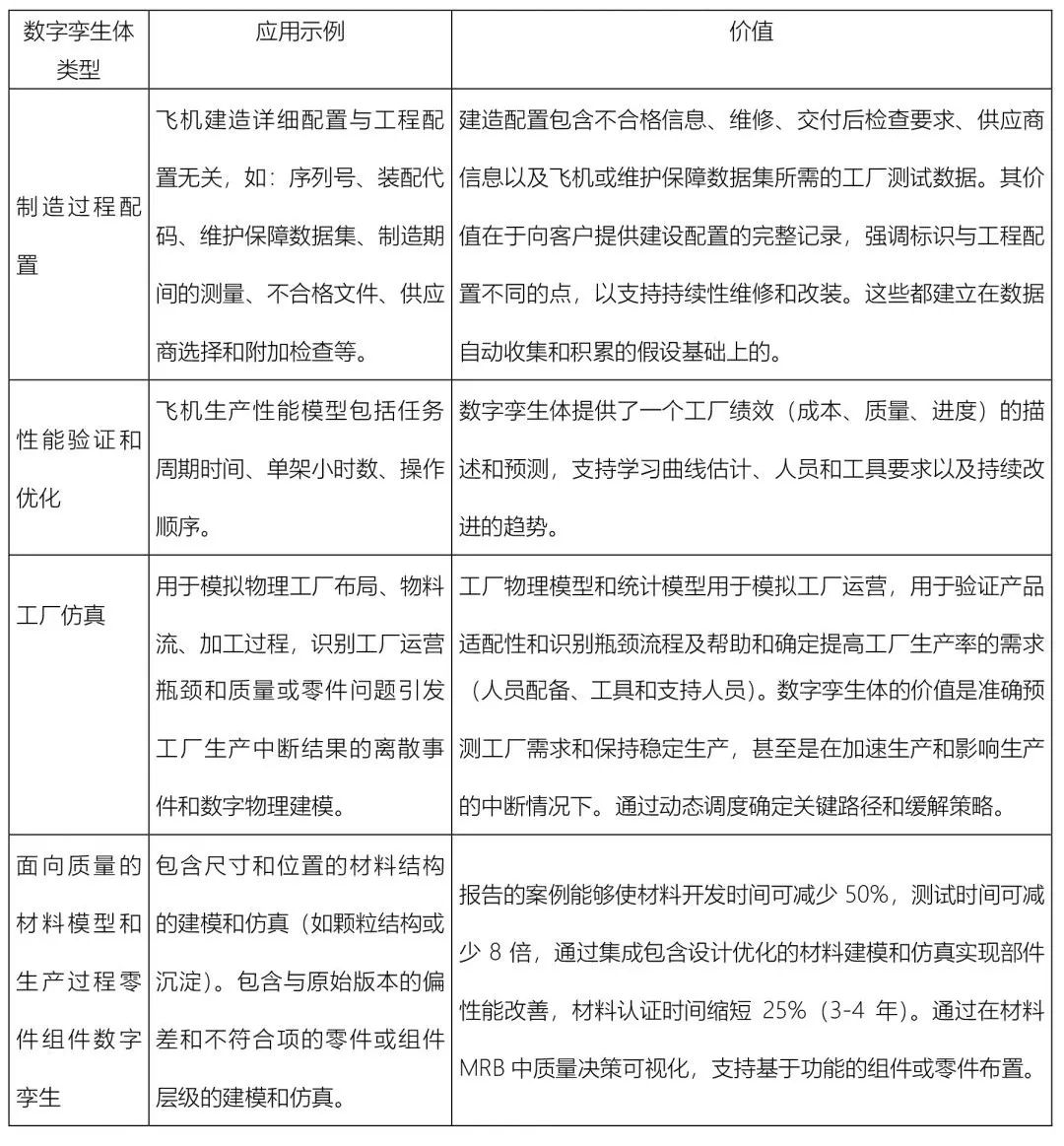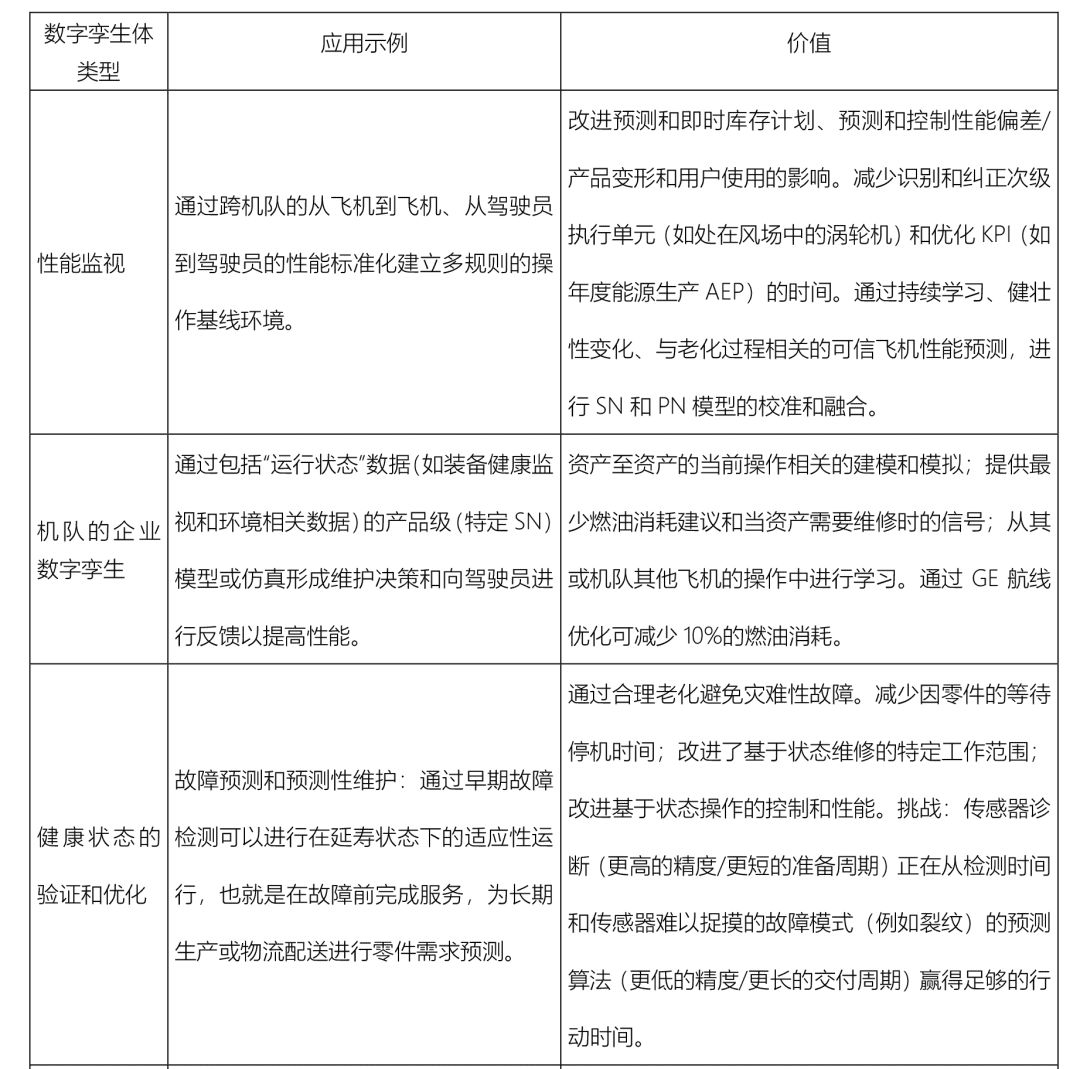 表2.1-2.3并不是詳盡列出,只是提供了代表性的數(shù)字孿生類型、應(yīng)用和可預(yù)測(cè)價(jià)值的案例。例如數(shù)字孿生體也可用于培訓(xùn)應(yīng)用(例如,將適當(dāng)?shù)腇AA模擬系統(tǒng)與飛機(jī)數(shù)字孿生體連接,用以預(yù)測(cè)在不同操作場(chǎng)景下的飛行性能)。其他潛在的數(shù)字孿生應(yīng)用包括可靠性、可用性、可維護(hù)性、安全預(yù)測(cè),事故重建和庫(kù)存預(yù)測(cè)及評(píng)估。所有的數(shù)字孿生潛在應(yīng)用都待將來(lái)進(jìn)一步開(kāi)發(fā)。