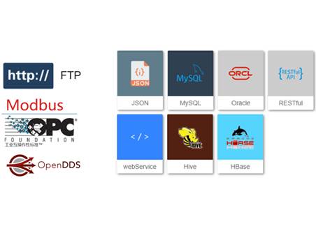 系統(tǒng)支持多種類型的采集協(xié)議,包括HTTP、FTP、Modbus、OPC UA、OpenDDS等,提供豐富的數(shù)據(jù)采集接口,支持的數(shù)據(jù)源類型包括JSON、MySQL、Oracle、RESTful、webService、Hive、HBase等。