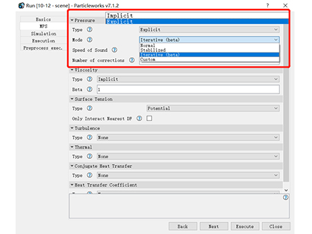 ParticleWorks的壓力計(jì)算提供顯式、隱式2種求解方法,并且在壓力計(jì)算時(shí),提供了抑制壓力震蕩模型和負(fù)壓模型。